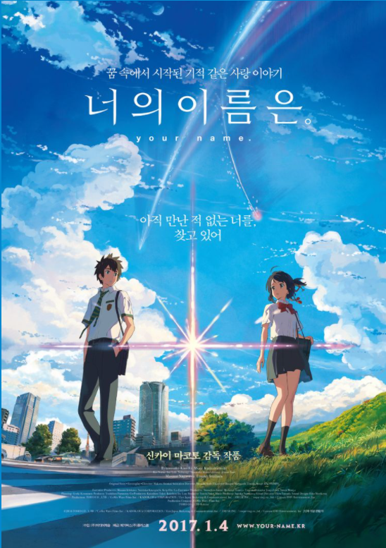 포스팅을 하면서 알게된 점에 의미가 있다. 너의 이름은. 옆에 마침표가 있는데, 이름이 무엇인지 질문형이 될 수도 있고, '나는 너의 이름을 알아!'하는 느낌표의 문장이 될 수 있고, 이름을 잊었다 라는 의미가 될 수가 있어서 관객이 자유롭게 상상하는대로 해석이 될 수 있는 제목이라고 한다. 너의 이름은은 흥행한 일본 애니매이션 중 하나로, 흥행 1억달러 이상인 일본 애니매이션 중 3위를 기록했다. 1위는 귀멸의 칼날 극장판 무한열차 편이고, 2위는 센과 치히로의 행방불명이다. 4위는 하울의 움직이는 성이며, 5위는 벼랑 위의 포뇨이다.